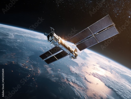 Sleek High-Tech Artificial Satellite Orbiting Earth Amid Twinkling Stars