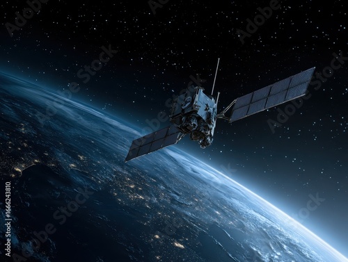 Sleek High-Tech Artificial Satellite Orbiting Earth Amid Twinkling Stars