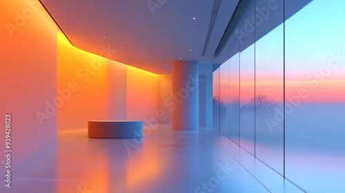 Sleek interior with bold orange lighting, large glass windows, and minimalist design overlooking a sunset view