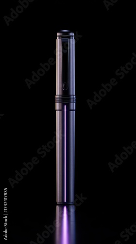 Sleek Metallic Vaporizer Pen with Vibrant Purple and Blue Lighting on Black Background.