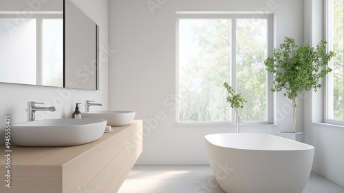 Sleek minimalist bathroom design with double sinks, crisp lines, and a neutral palette, evoking clean and modern aesthetics.