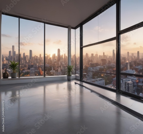 Sleek modern apartment, panoramic city view from large window , modern, wood