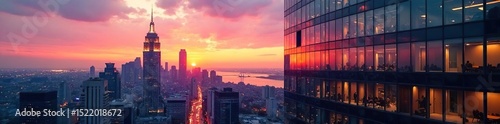 Sleek modern city office building reflecting the urban skyline at sunset Glass facade, contemporary architecture, vibrant cityscape backdrop , success, light, contemporary