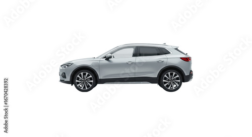 Sleek, modern compact SUV in contemporary neutral color, refined design, against expansive transparent studio background with soft lighting, concept of advanced automotive innovation