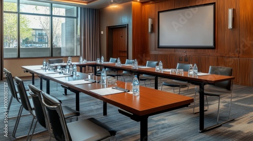 Sleek, modern conference room equipped with facilities like a projector, video conferencing, and high-quality audio system.