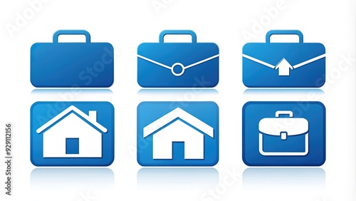Sleek modern icon set featuring combined home and briefcase symbols, blending personal and professional life, in blue and white minimalist design elements.