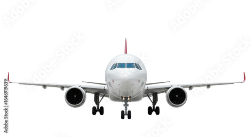 Sleek, modern white commercial jet with red tail accents, large engines, and extended landing gear, in a transparent studio background. Concept of global connectivity and advanced air travel