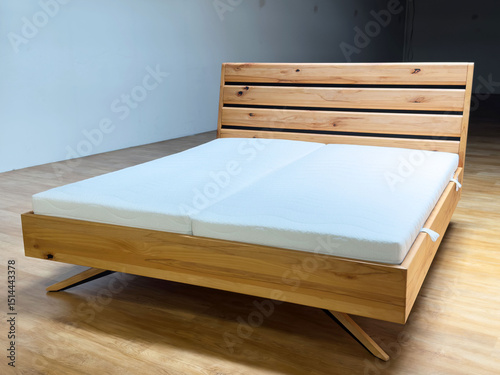 Sleek modern wooden bed frame with minimalist design in spacious room