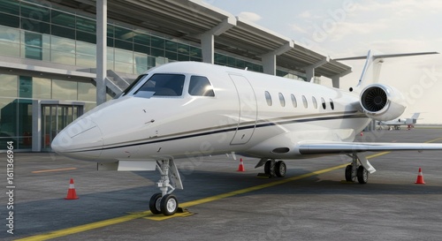 Sleek private jet parked at modern airport terminal, awaiting departure.