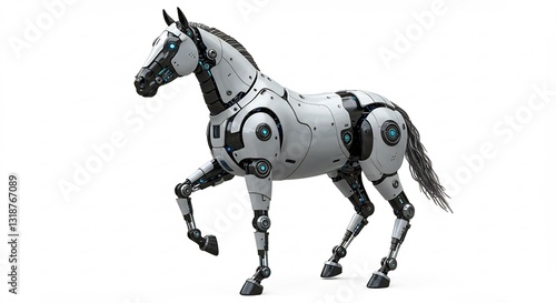 Sleek robotic horse powerfully strides forward under bright studio lighting. AI Generated