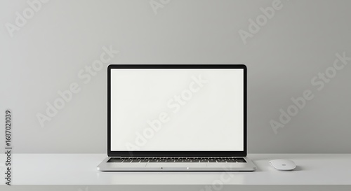 Sleek silver laptop with blank screen sits on minimalist white desk, wireless mouse beside it.