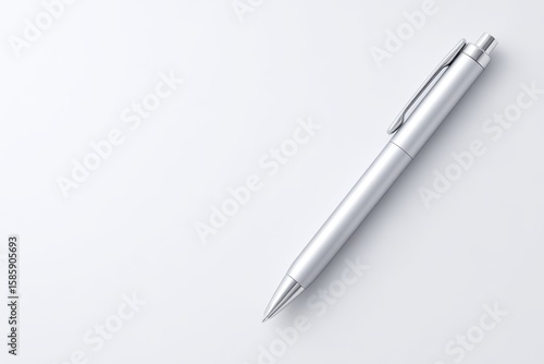 Sleek silver pen with a convenient clip rests diagonally on a pristine white surface, casting a shadow.