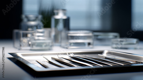 Sleek Surgical Instruments on a Tray with Glassware Background