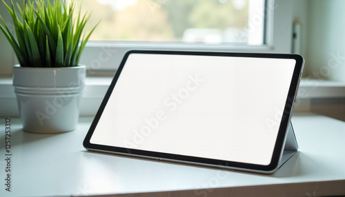 Sleek Tablet Mockup with Clean Interface and Potted Plant on White Desk with Natural Lighting