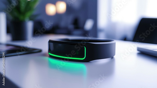 Sleek wearable tech bracelet, matte black surface, glowing green interface, placed on a white matte surface