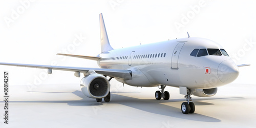 Sleek white commercial airliner with sleek wings and engines, standing alone on a pure white background, showcasing its modern design and aerodynamic features.