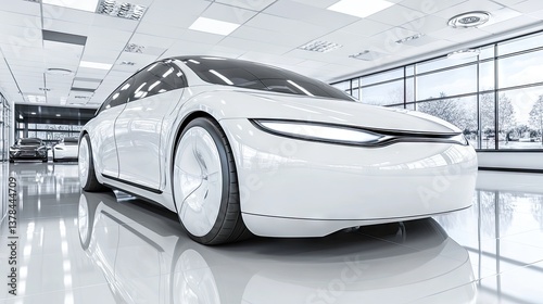 Sleek white electric car showcased in a modern, bright showroom