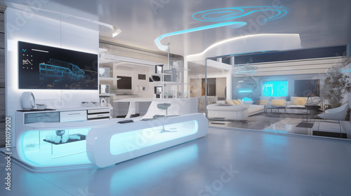 Sleek, white futuristic living space showcasing integrated smart technology, ambient lighting, and minimalist furniture. A large screen displays interactive data.