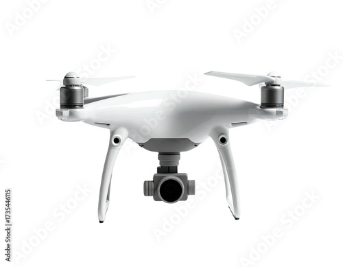 Sleek white quadcopter drone with camera, suspended against a pure black background