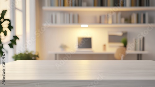 Sleek white rectangular wooden table with soft lighting and blurred contemporary home office background featuring desk and bookshelves