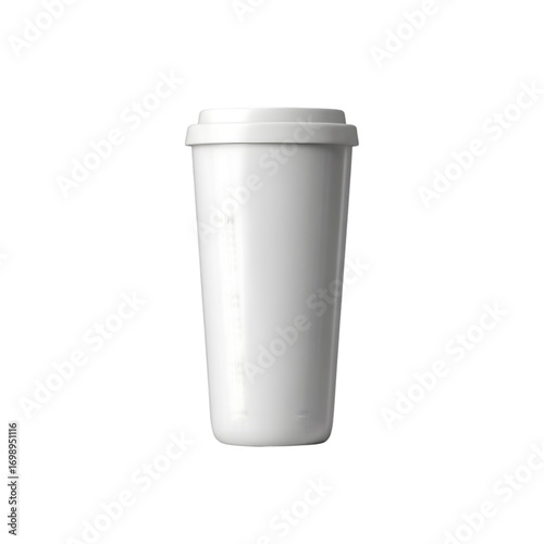 Sleek white reusable coffee tumbler with a smooth glossy finish and matching lid.