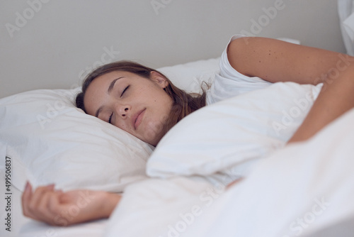 Sleep needs no explanation and is its own excuse. Shot of a young female sleeping in bed at home.