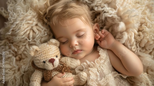Sleeping baby girl hugged by her toy teddy bear When viewed from above Conveying the essence of innocence and comfort during quiet relaxation time.