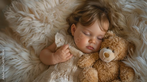 Sleeping baby girl hugged by her toy teddy bear When viewed from above Conveying the essence of innocence and comfort during quiet relaxation time.