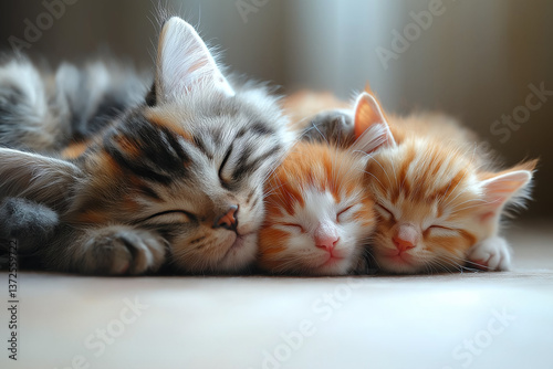 Sleeping kitten with fluffy fur, adorable and cozy in a calm, cute and gentle setting