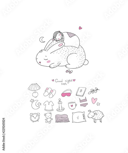sleeping set. cartoon girl and a rabbit. Sweet Dreams. Good night. Time to sleep. Cute animals.