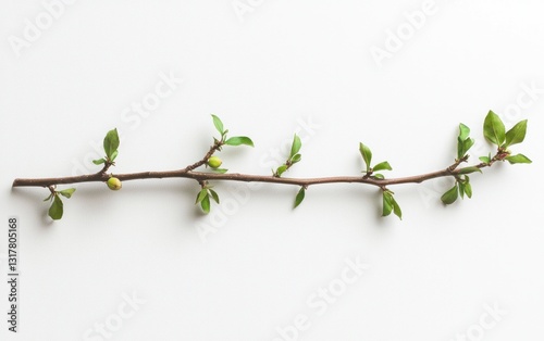 Slender Brown Branch with Vibrant Green Leaves on Off White Background