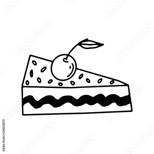Slice of cake with cherry in doodle hand drawn style. Coffee collection on an isolated white background. Stock vector illustration.