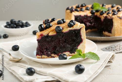 Slice of delicious homemade blueberry pie served on light table, closeup