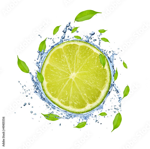 Slice of lime in water splash, isolated on white background