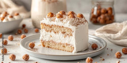 Slice of Malted Milk Cake with Malted Buttercream Frosting on White Plate With Malt Balls