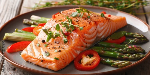 Slice of salmon garnished with fresh herbs, accompanied by blanched asparagus and red pepper on a serving plate with utensils.