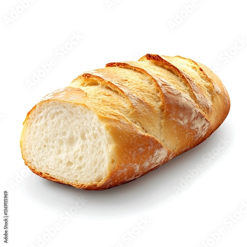 Sliced Baguette Loaf with Golden Crust on White Background Studio Shot Isolated