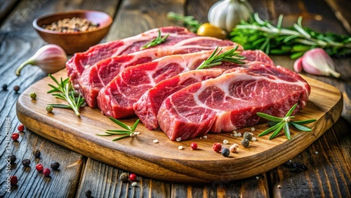 Sliced beef, pork, lamb, and chicken: a raw meat cutting board candid.