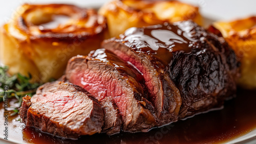 Sliced beef steak with gravy served on a plate with sides.