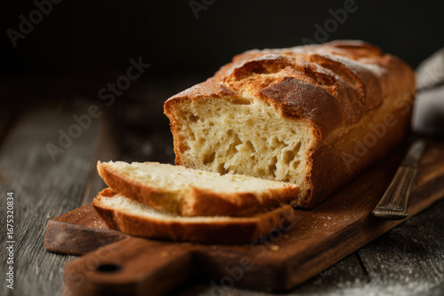 Sliced bread on a dark wooden board with a knife and cloth, ideal for rustic food blogs or bakery menus, or food packaging designs.