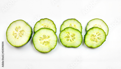 Sliced cucumber rounds arranged on white surface, freshness and simplicity