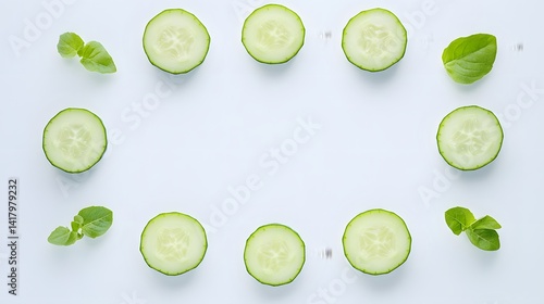Sliced cucumbers and fresh basil leaves arranged in a frame on a light blue background. Perfect for health, beauty, or summer-themed projects.