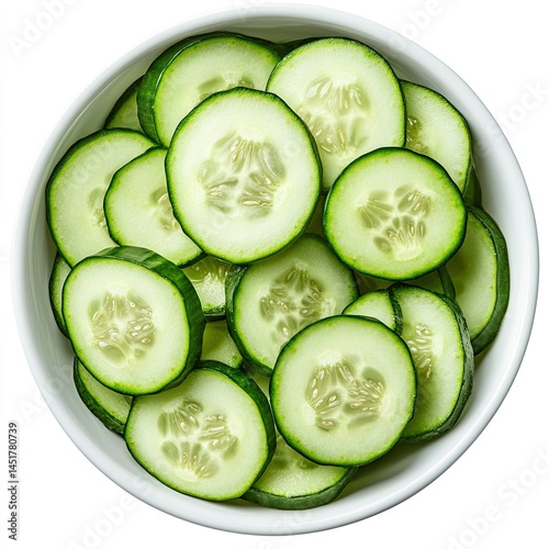 Sliced cucumbers in a white bowl. Freshly cut cucumber slices, light green, are neatly arranged in a round white bowl. The slices are various thicknesses, and the seeds are visible in some