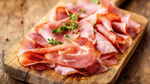 Sliced cured meat on a wooden board, garnished with fresh herbs.