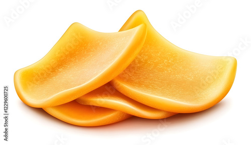 Sliced dried apricots isolated on a white background, a photorealistic image.