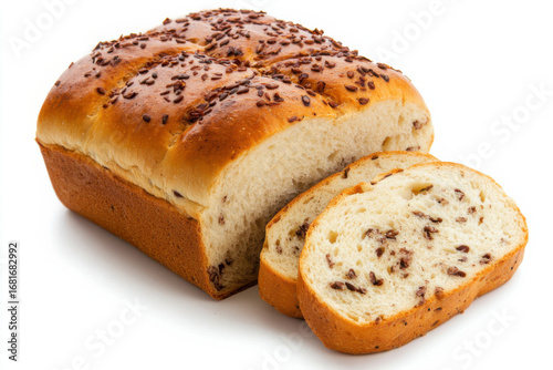 Sliced freshly baked bread loaf ready to be enjoyed, isolated on a white background