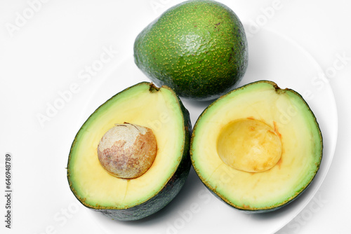 Sliced green avocado on a white background. Pieces of green vegetable on a white plate. Delicious food for a vegan.
