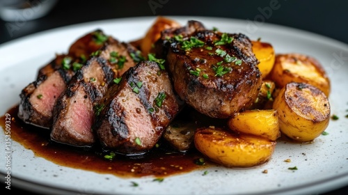 Sliced grilled steak with roasted potatoes. A delectable dish featuring juicy, sliced steak, perfectly seasoned and grilled to a tender perfection.