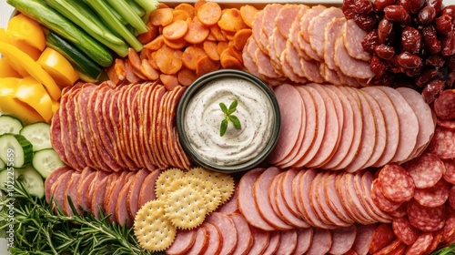Sliced ham sausage laid out on a serving tray with fresh vegetables, dips, and crackers for a party platter.