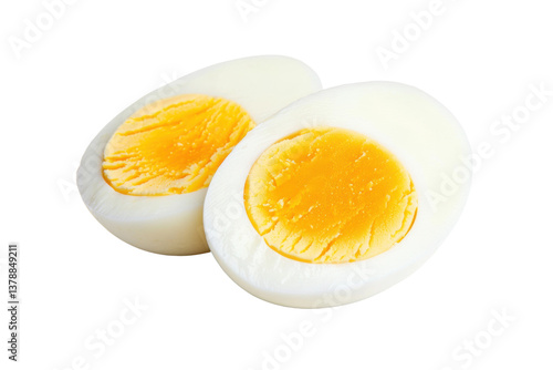 Sliced hard-boiled eggs with vibrant yellow yolks against black background, cut out